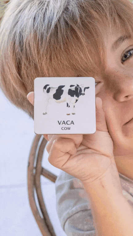 Cada ficha está acompañada por su nombre en inglés y castellano, ideal para jugar, aprender y disfrutar en familia.